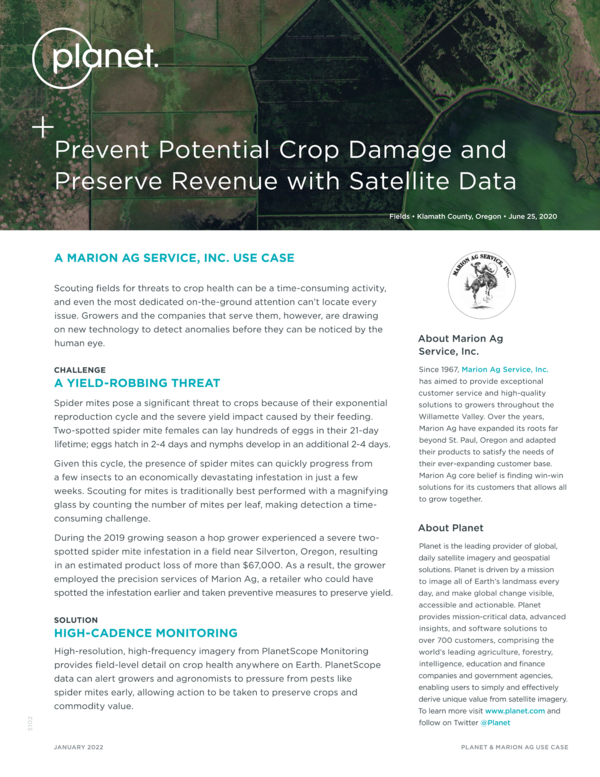 With reliable data from Planet, Marion Ag Service allows agronomists and growers to see early signs of pests like spider mites early, allowing action to be taken to preserve crops and commodity value.