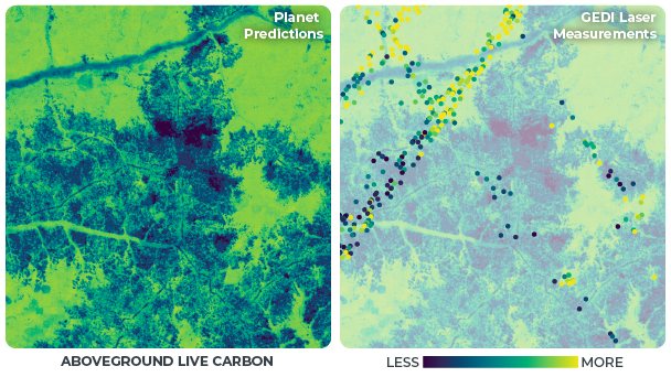 Drawing on cutting-edge scientific methods, we utilize deep learning models trained and validated on a massive global library of airborne LiDAR totalling more than 14 million square kilometers to produce estimates of forest height and cover. We leverage NASA’s Global Ecosystem Dynamics Investigation (GEDI) spaceborne LiDAR to convert these estimates into wall-to-wall, GEDI-like, forest carbon data. Each metric relies on novel cloud masking, pixel selection, multi-sensor fusion (including Planetscope, Sentinel-2, Landsat, and ALOS-PALSAR-2), and temporal harmonization techniques developed to minimize year-over-year measurement variability. The result is a unique, high-quality data feed which can capture nearly tree-scale forest change globally and provide actionable monitoring of carbon stocks.