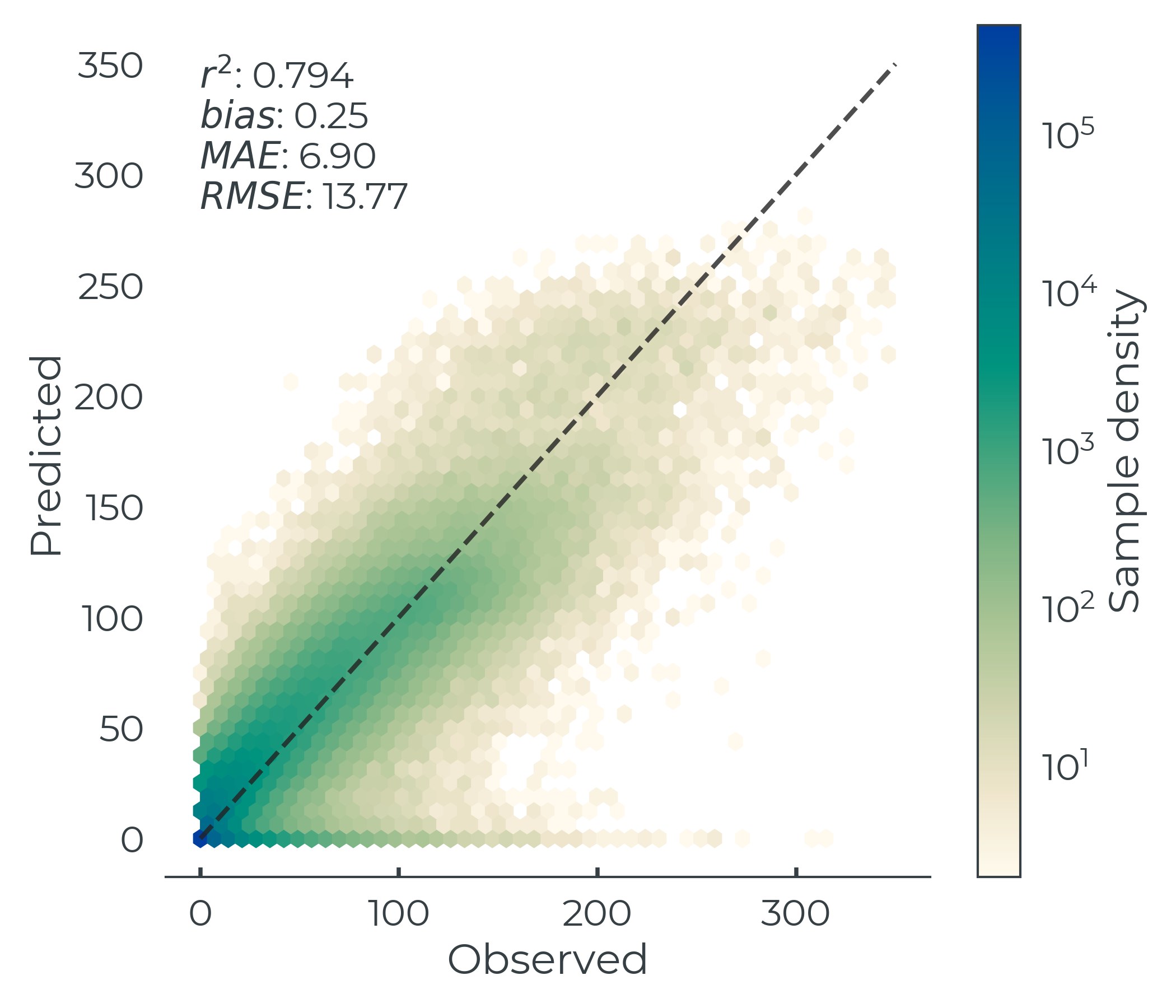 Planet’s Forest Carbon Diligence estimated aboveground live carbon (left) over a region in the Congo Basin of Central Africa. Spaceborne LiDAR measurements from the GEDI mission (center) shown as a series of sparse points across the landscape. Scatterplot with associated validation metrics comparing the observed GEDI measured carbon to Planet's predicted carbon estimates at 1 sq km resolution (right).